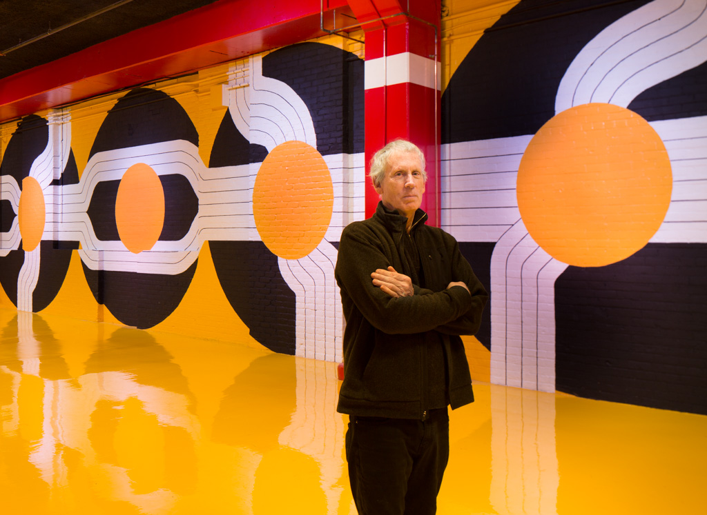 Detroit Deconstructionist artist, Robert Sestok in front of 33/45 Mural at Third Man Pressing in Cass Corridor, Detroit, MI (2016)